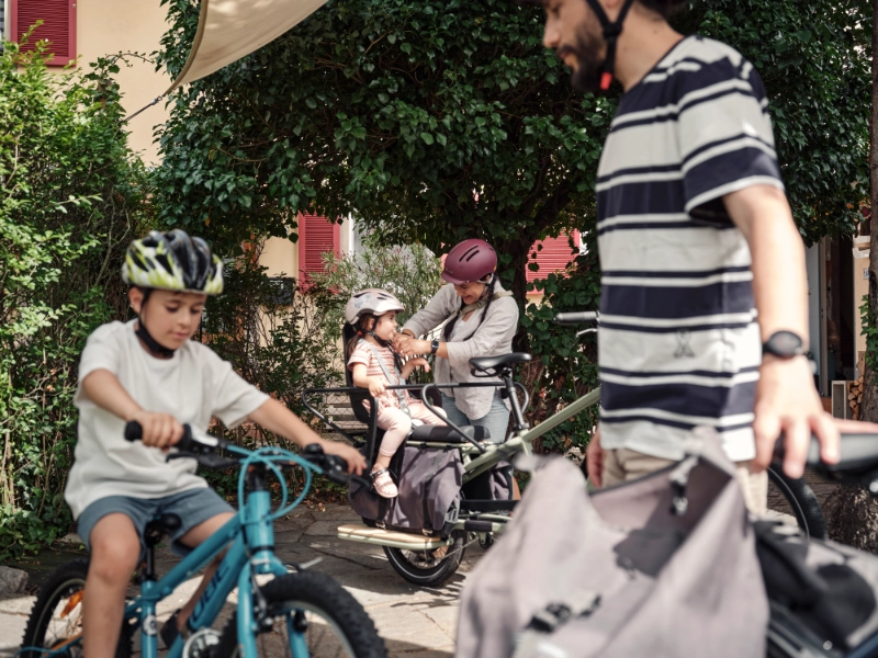Eltern mit 2 Kindern steigen auf JobRäder im Grünen